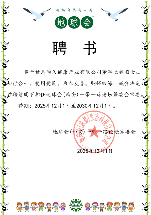 鉴于甘肃陨久健康产业有限公司董事长魏燕女士知行合一、爱国爱民、为人友善、胸怀四海,我会决定:兹聘请阁下担任地球会(西安)一带一路论坛筹委会常委。